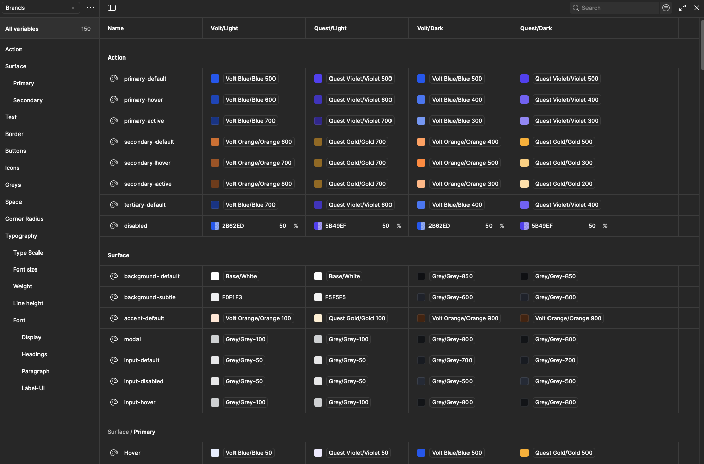 Process: I began by mapping out the distinct brand identities of Volt (energetic, confident, blue/orange) and Quest (sophisticated, premium, violet/gold). This informed the creation of our two-tier token system.
